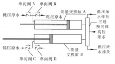 低壓原水從單向閥 A 或單向閥 C 進入能量回收裝置,充滿能量交換缸 A 或 能量交換缸 B;高壓濃水從五通換向閥進入能量回收裝置,當五通換向閥使高 壓濃水與能量交換缸 A 連通時,高壓濃水將能量傳遞給低壓原水,實現(xiàn)能量交 換,高壓原水從單向閥 B 進入反滲透膜壓力容器進行脫鹽處理;待將能量交換 缸 A 中的原水全部加壓送至反滲透系統(tǒng)后,五通換向閥,將高壓濃水與能量交 換缸 B 連通,重復(fù)上述能量交換過程,同時能量交換缸 A 中低壓原水進入,排 出低壓濃水。兩個能量交換缸交替進行高壓濃水與低壓原水的能量交換,實現(xiàn) 將低壓原水連續(xù)增壓送至反滲透系統(tǒng)進行脫鹽處理。