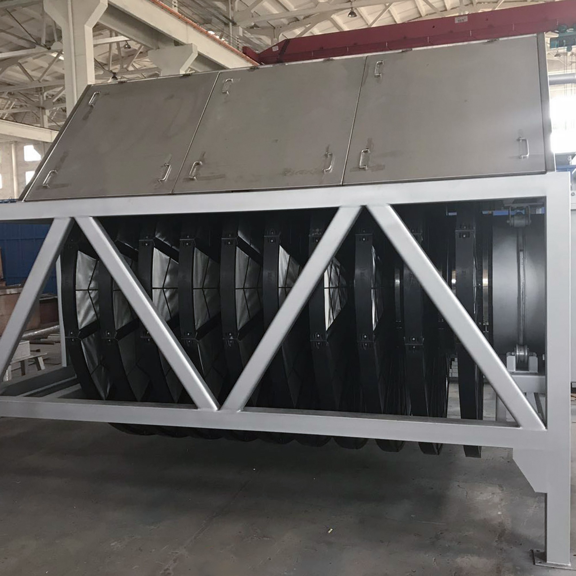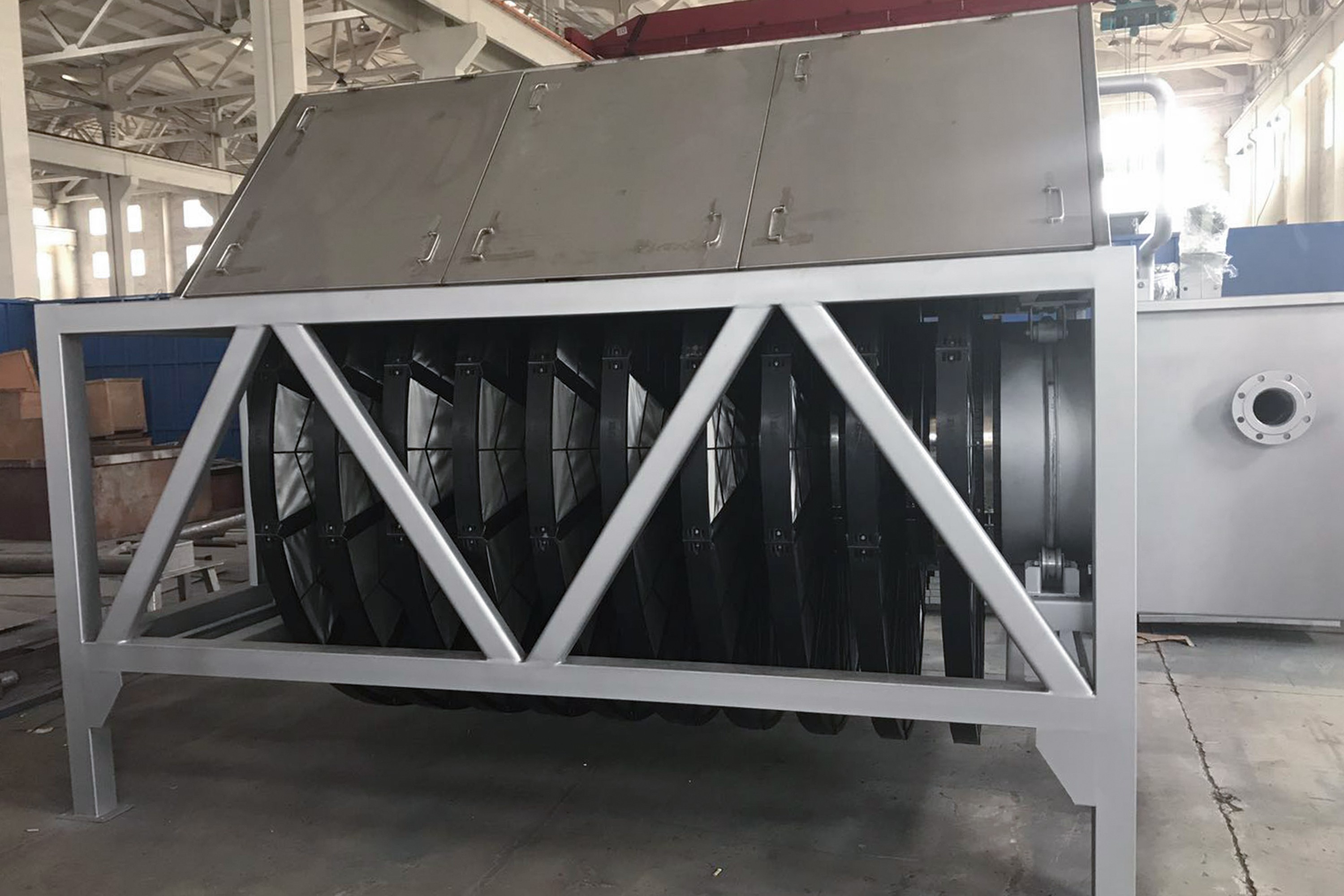 濾布濾池:該系統(tǒng)包括混泥土池體、進(jìn)水堰箱、出水可調(diào)堰板、支撐軸座、中空設(shè)備主體(等邊六角形或者圓形)、纖維濾盤、支撐滑輪、出水口密封組件、排污系統(tǒng)、驅(qū)動(dòng)裝置、自動(dòng)化控制系統(tǒng)。設(shè)備主體端部與支撐軸座法蘭連接,出水管置于支撐滑輪上,并安裝出水密封組件;纖維濾盤垂直安裝在設(shè)備主體上;濾盤內(nèi)部設(shè)有骨架,用于支撐包裹在外面的濾布,骨架中空,并與設(shè)備主體連接固定后形成一個(gè)外部密封,內(nèi)部中空的整體;排污系統(tǒng)包括池底排污和濾盤反洗,每個(gè)濾盤的兩側(cè)設(shè)有反抽吸裝置。運(yùn)行時(shí),污水經(jīng)過(guò)進(jìn)水堰箱,均勻進(jìn)入濾池,由外向內(nèi)通過(guò)濾盤,由濾盤上的濾布截留污物后的凈水進(jìn)入中空設(shè)備主體,然后排出池外。