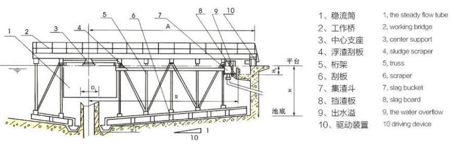 ?概述:GZB 型周邊傳動刮吸泥機適用于市政、造紙、化工、冶金、石油等行業(yè)的18cm 以上的沉淀池或濃縮池的污泥清除,是水處理的理想機械設備,其工作原理為周邊驅動橋架繞中心支座帶動刮泥板旋轉,將沉降池底的污泥刮到中心集泥坑排出,液面浮渣由刮泥板濃縮至集渣斗排出。